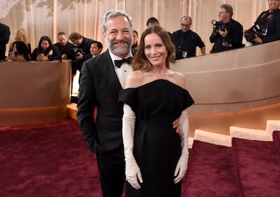 Judd Apatow, left, and Leslie Mann arrive at the 83rd Golden Globes on Sunday, Jan. 11, 2026, at the Beverly Hilton in Beverly Hills, Calif. (Photo by Richard Shotwell/Invision/AP)