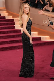 Pamela Anderson arrives at the 83rd Golden Globes on Sunday, Jan. 11, 2026, at the Beverly Hilton in Beverly Hills, Calif. (Photo by Jordan Strauss/Invision/AP)