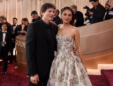 Ashton Kutcher, left, and Mila Kunis arrive at the 83rd Golden Globes on Sunday, Jan. 11, 2026, at the Beverly Hilton in Beverly Hills, Calif. (Photo by Jordan Strauss/Invision/AP)