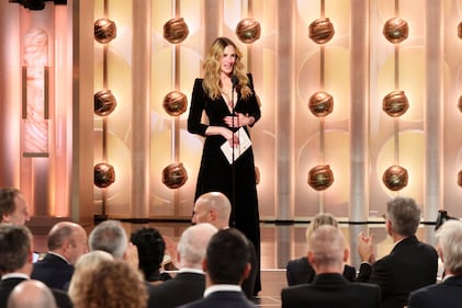 This image released by CBS Broadcasting shows presenter Julia Roberts during the 83rd Golden Globes on Sunday, Jan. 11, 2026, at the Beverly Hilton in Beverly Hills, Calif. (Kevork Djansezian/CBS Broadcasting via AP)