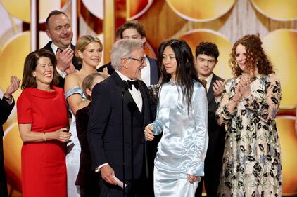 This image released by CBS Broadcasting shows Steven Spielberg, foreground left, and Chloe Zhao, foreground right, with cast members as they accept the award for best motion picture drama for "Hamnet" during the 83rd Golden Globes on Sunday, Jan. 11, 2026, at the Beverly Hilton in Beverly Hills, Calif. (Kevork Djansezian/CBS Broadcasting via AP)