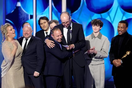 This image released by CBS Broadcasting shows Sara Murphy, foreground left, appearing with writer-director Paul Thomas Anderson, foreground right, and other cast members, as well as presenter Julia Roberts, right, as they accept the award for best motion picture - musical or comedy for "One Battle After Another" during the 83rd Golden Globes on Sunday, Jan. 11, 2026, at the Beverly Hilton in Beverly Hills, Calif. (Kevork Djansezian/CBS Broadcasting via AP)