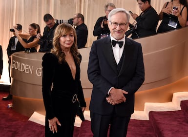 Kristie Macosko Krieger, left, and Steven Spielberg arrive at the 83rd Golden Globes on Sunday, Jan. 11, 2026, at the Beverly Hilton in Beverly Hills, Calif. (Photo by Richard Shotwell/Invision/AP)