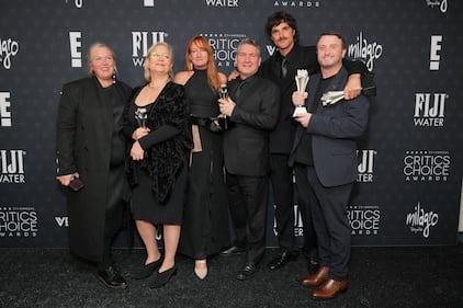 "Frankenstein" cast and crew Kate Hawley, from left, winner of the award for Best Costume Design, Tamara Deverell, winner of the award for Best Production Design, Cliona Furey, winner of the award Best Hair and Make-Up, Jordan Samuel, winner of the award for Best Hair and Make-Up, Jacob Elordi, winner of Best Supporting Actor, and Mike Hill, winner of Best Hair and Make-Up, pose in the press room during the 31st Annual Critics Choice Awards on Sunday, Jan. 4, 2026, at The Barker Hanger in Santa Monica, Calif. (Photo by Jordan Strauss/Invision/AP)