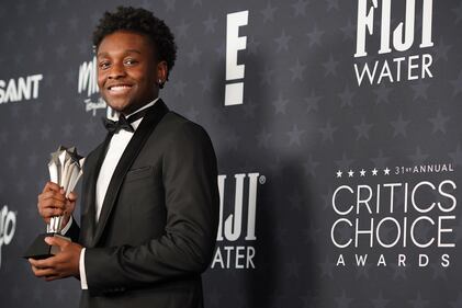 Miles Caton, winner of the award for best young actor/actress for "Sinners," poses in the press room during the 31st Annual Critics Choice Awards on Sunday, Jan. 4, 2026, at The Barker Hanger in Santa Monica, Calif. (Photo by Jordan Strauss/Invision/AP)