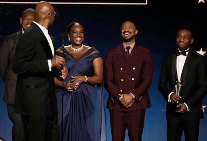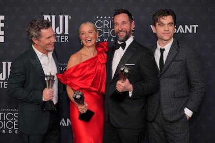 Omar Benson Miller, from left, Delroy Lindo, Wunmi Mosaku, Michael B. Jordan, and Miles Caton accept the award for best casting and ensemble for "Sinners" during the 31st Annual Critics Choice Awards on Sunday, Jan. 4, 2026, at The Barker Hanger in Santa Monica, Calif. (AP Photo/Chris Pizzello)