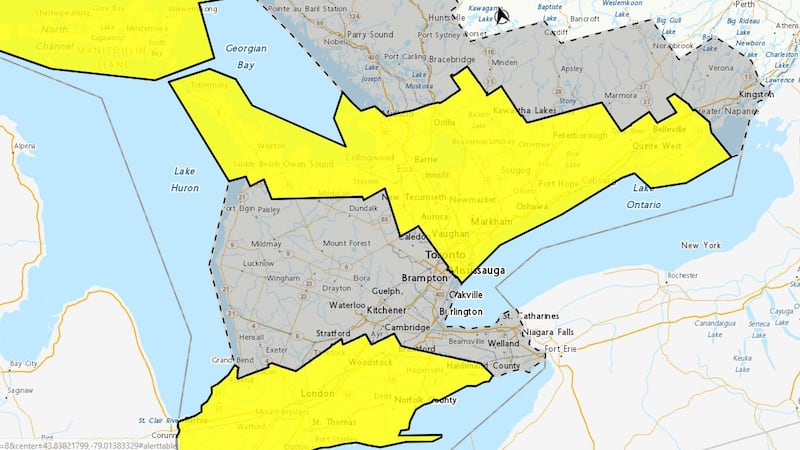A yellow warning is currently in place for Toronto, York Region, Durham Region, Barrie, Peterborough, Belleville and parts of cottage country, as well as large swathes of southwestern and Northern Ontario.