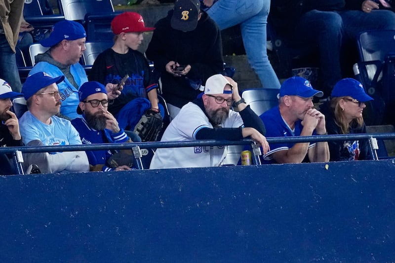 Fans watch on hopeful Toronto Blue Jays fans look on during sixth inning MLB American League Championship Series game 7 baseball action between the Seattle Mariners and the Toronto Blue Jays, in Toronto, Monday, Oct. 20, 2025. (Chris Young/THE CANADIAN PRESS)