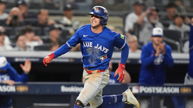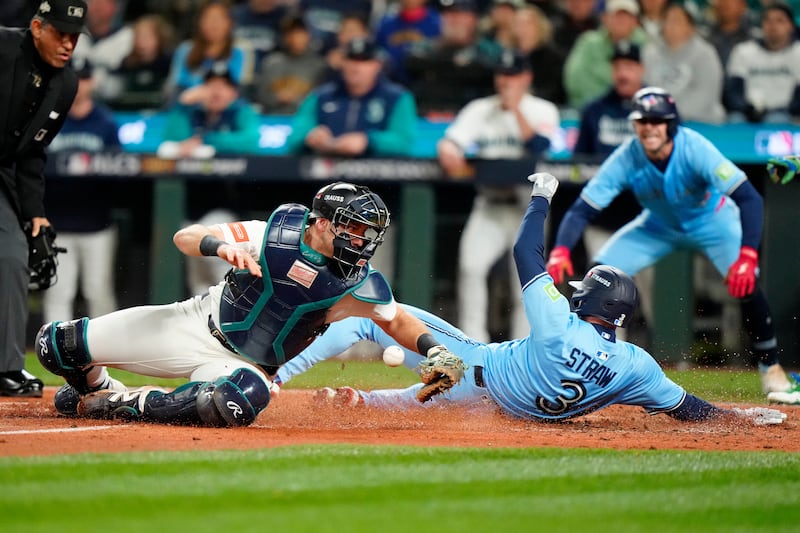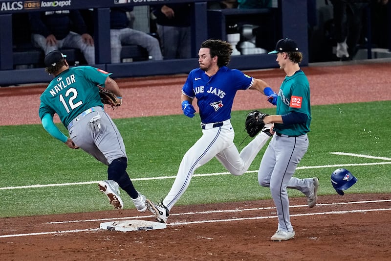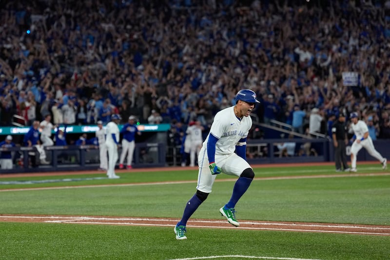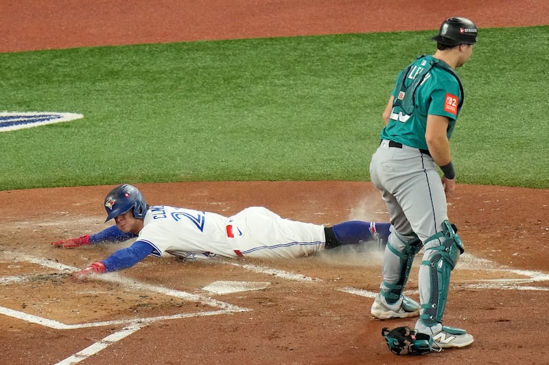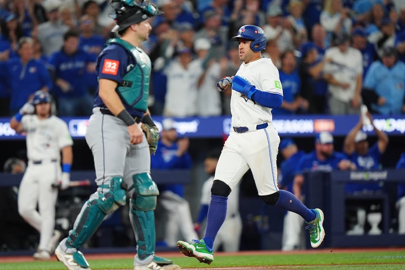 Varsho comes in to score Toronto Blue Jays' Daulton Varsho (5) runs home to score against the Seattle Mariners during second inning MLB American League Championship Series game 6 baseball action in Toronto, Sunday, Oct. 19, 2025. (Frank Gunn/THE CANADIAN PRESS)