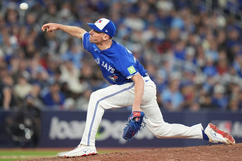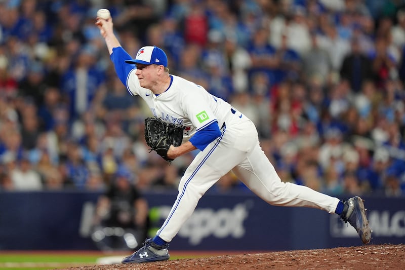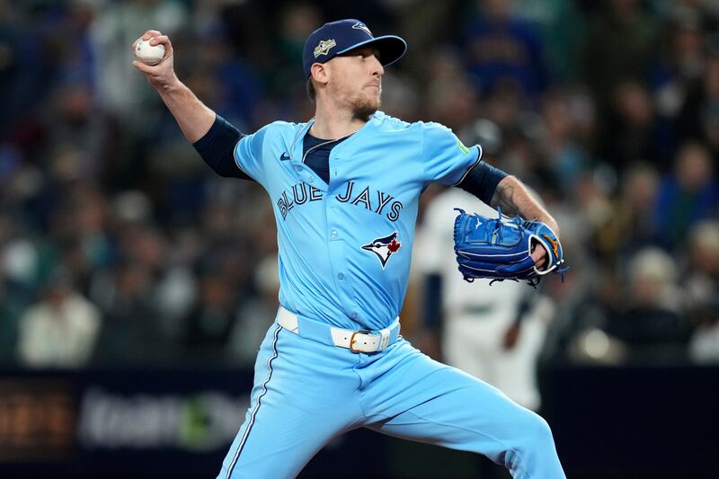 Varland enters the game in relief Toronto Blue Jays pitcher Louis Varland (77) works against the Seattle Mariners during sixth inning MLB American League Championship Series game 6 baseball action in Toronto, Sunday, Oct. 19, 2025. (Frank Gunn/THE CANADIAN PRESS)