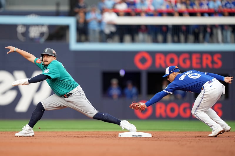 Naylor interferes with double play attempt Seattle Mariners' Josh Naylor (12) leaps as he's hit with a throw to first base by Toronto Blue Jays third base Ernie Clement (22) trying to turn a double play during first inning MLB American League Championship Series game 7 baseball action in Toronto, Monday, Oct. 20, 2025. Interference by Naylor was ruled on the play and the out at first was given to the Blue Jays. (Frank Gunn/THE CANADIAN PRESS)