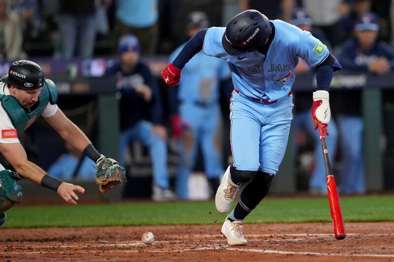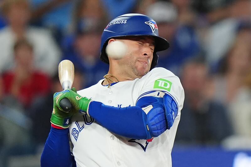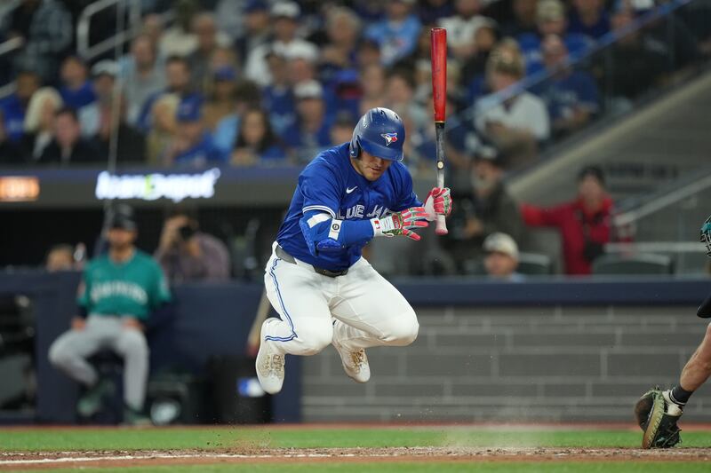 Springer narrowly avoids pitch Toronto Blue Jays' George Springer (4) ducks out of the way of an inside pitch during eighth inning MLB American League Championship Series game 6 baseball action against the Seattle Mariners in Toronto, Sunday, Oct. 19, 2025. (Frank Gunn/THE CANADIAN PRESS)