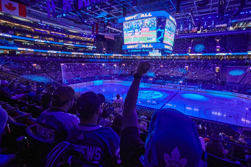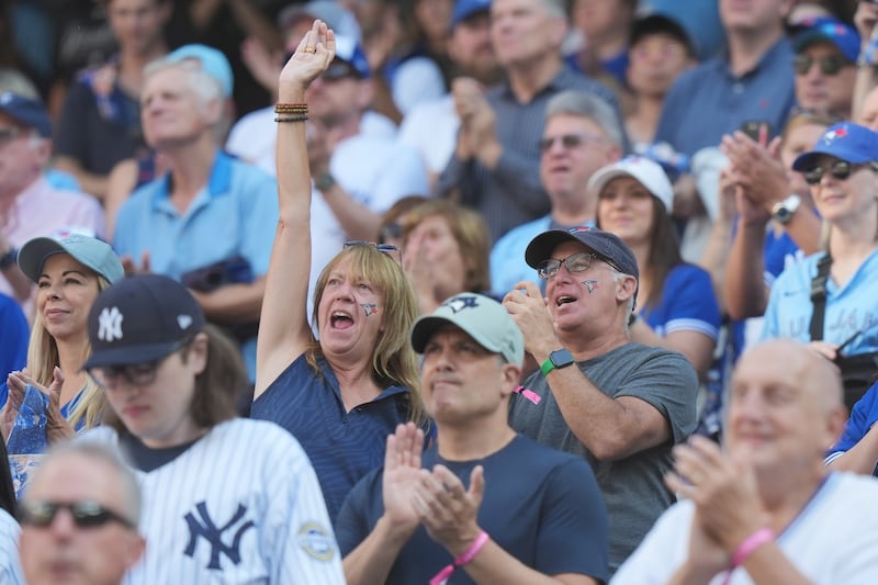 Taking over downtown intersections, fans also sing the Canadian national anthem and “OK Blue Jays,” the team’s seventh-inning stretch song.
