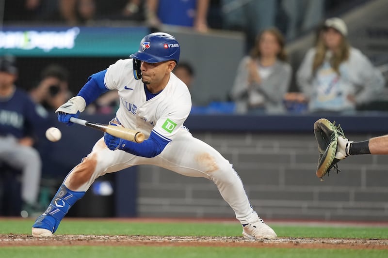 Giménez helps advance the runners Toronto Blue Jays' Andrés Giménez (0) lays down a sacrifice bunt during seventh inning MLB American League Championship Series game 7 baseball action against the Seattle Mariners in Toronto, Monday, Oct. 20, 2025. (Nathan Denette/THE CANADIAN PRESS)
