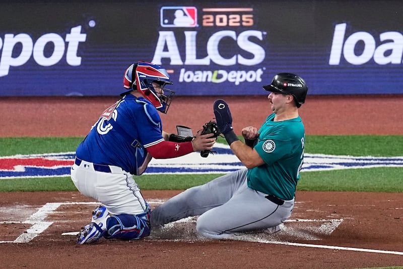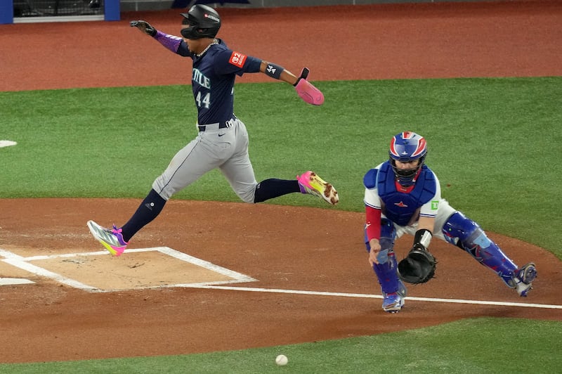 Rodríguez gets the Mariners on the board first Seattle Mariners outfielder Julio Rodríguez (44) scores in front of Toronto Blue Jays catcher Alejandro Kirk (30) on an RBI single from teammate Josh Naylor (12) during first inning MLB American League Championship Series game 7 baseball action in Toronto, Monday, Oct. 20, 2025. (Chris Young/THE CANADIAN PRESS)