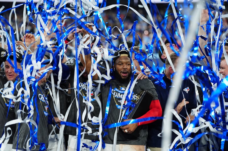 Guerrero Jr. gets covered in streamers Toronto Blue Jays' Vladimir Guerrero Jr. and the Blue Jays celebrate after defeating the Seattle Mariners in MLB American League Championship Series game 7 baseball action in Toronto, Monday, Oct. 20, 2025. (Frank Gunn/THE CANADIAN PRESS)
