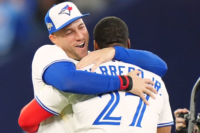 Springer and Guerrero Jr. hug after the Game 7 win Toronto Blue Jays' George Springer, left, and Vladimir Guerrero Jr. celebrate after defeating the Seattle Mariners in MLB American League Championship Series game 7 baseball action in Toronto, Monday, Oct. 20, 2025. (Frank Gunn/THE CANADIAN PRESS)