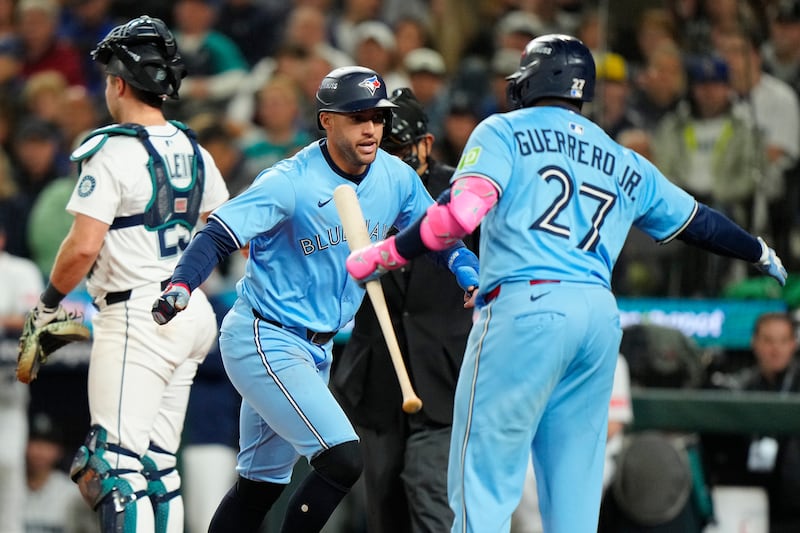 Springer hits a home run to give the Jays a 4-3 lead Toronto Blue Jays' George Springer (4) reacts after hitting a three-run home run against the Seattle Mariners during seventh inning MLB American League Championship Series game 7 baseball action in Toronto, Monday, Oct. 20, 2025. (Nathan Denette/THE CANADIAN PRESS)