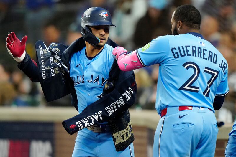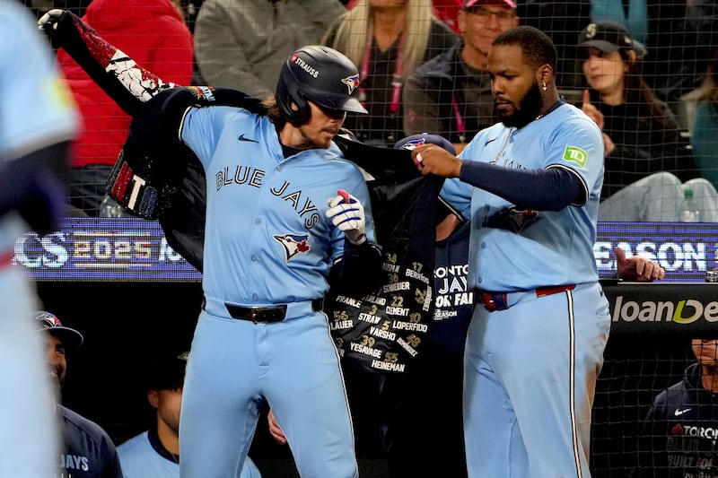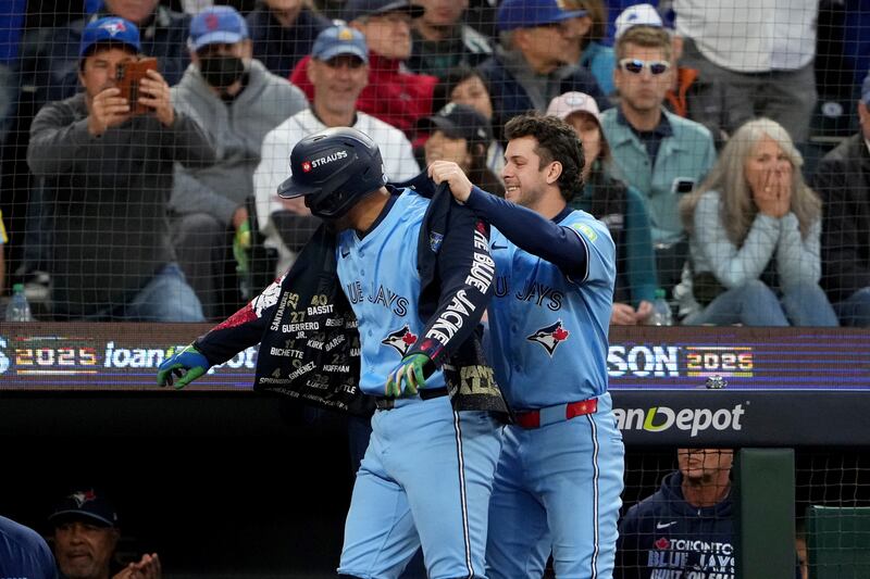 Barger hits big homer Toronto Blue Jays' Addison Barger (47) celebrates with Vladimir Guerrero Jr. after hitting a two-run home run against the Seattle Mariners during third inning MLB American League Championship Series game 6 baseball action in Toronto, Sunday, Oct. 19, 2025. (Frank Gunn/THE CANADIAN PRESS)