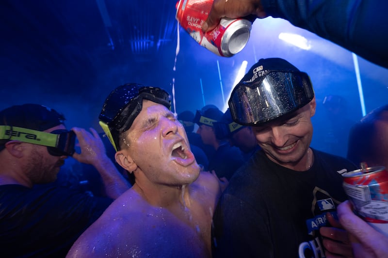 Blue Jays players down beer in the clubhouse Toronto Blue Jays' Daulton Varsho celebrates in the clubhouse after defeating the Seattle Mariners in MLB American League Championship Series game 7 baseball action in Toronto, Monday, Oct. 20, 2025. (Frank Gunn/THE CANADIAN PRESS)