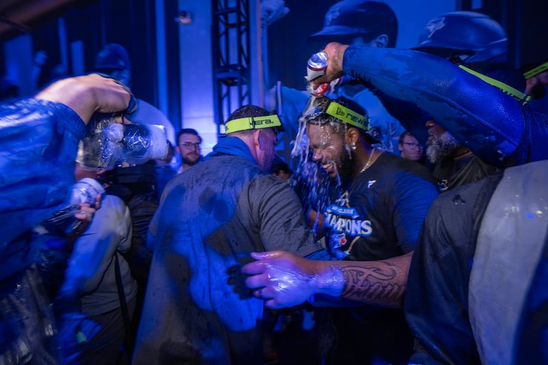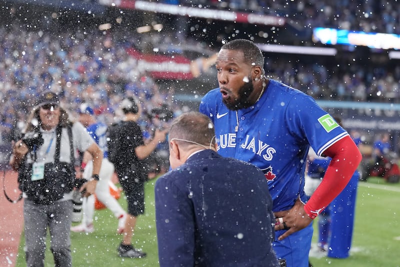 Vladdy gets drenched in the clubhouse Toronto Blue Jays' Vladimir Guerrero Jr. celebrates in the clubhouse after the Blue Jays defeated the Seattle Mariners in MLB American League Championship Series game 7 baseball action in Toronto, Monday, Oct. 20, 2025. (Frank Gunn/THE CANADIAN PRESS)