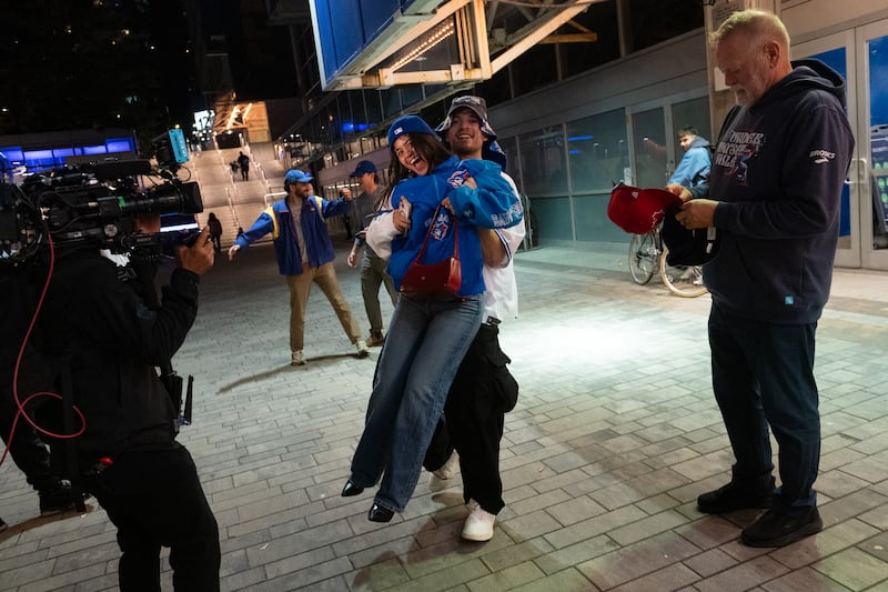 Celebrations outside Rogers Centre Toronto Blue Jays fans react after the team beat the Seattle Mariners to win the American League Championship Series, in Toronto, Monday, Oct. 20, 2025. THE CANADIAN PRESS/Laura Proctor (Laura Proctor/The Canadian Press)