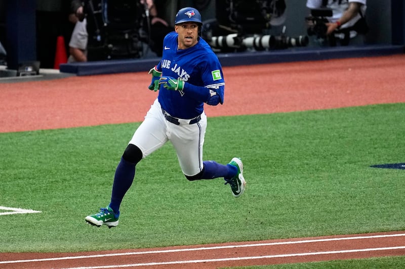 Springer scores on Varsho single Toronto Blue Jays' George Springer (4) scores a single by Daulton Varsho (not shown) during first inning MLB American League Championship Series game 7 baseball action against the Seattle Mariners in Toronto, Monday, Oct. 20, 2025. (Frank Gunn/THE CANADIAN PRESS)