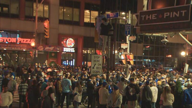 People are waving the Blue Jays’ rally towels while some are seen scaling street poles to mark the victory. Police have closed the roads around Rogers Centre to accommodate the celebrations.