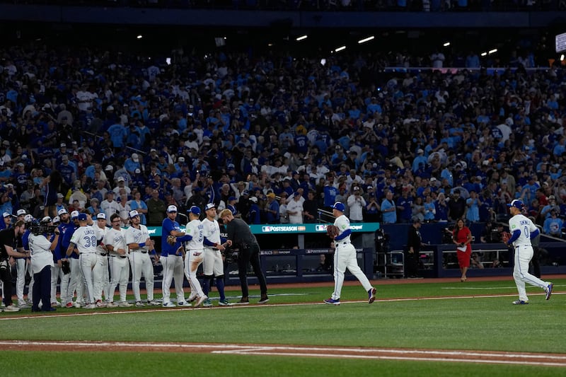 Blue Jays players run to congratulate Hoffman The Toronto Blue Jays celebrate after Game 7 of baseball's American League Championship Series against the Seattle Mariners, Monday, Oct. 20, 2025, in Toronto.= (David J. Phillip/AP)