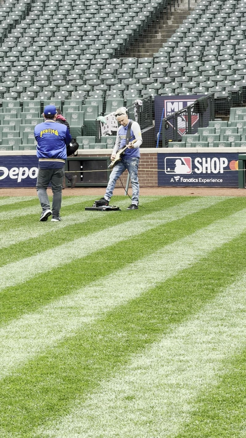 Mike McCready lead guitarist of Pearl Jam going through sound check. He’ll perform the American national anthem ahead of game 4.