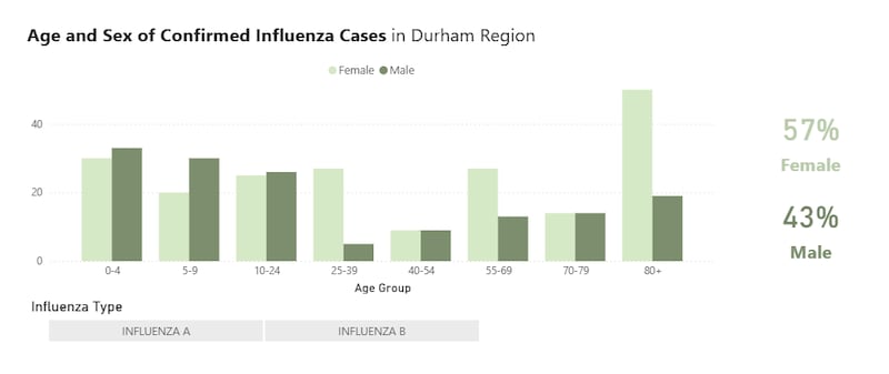 Durham Region Public Health reported more than 150 new cases in the past week alone, bringing its total to 373. Almost all of them being influenza A. The virus has been most prevalent in residents over 80 and children under 10.