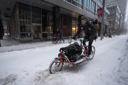 A cargo cyclist rides along Adelaide Street East amid heavy snowfall and accumulation as snow and heavy winds continue to hammer the Greater Toronto Area, in Toronto, Thursday, Jan. 15, 2026. THE CANADIAN PRESS/Giordano Ciampini