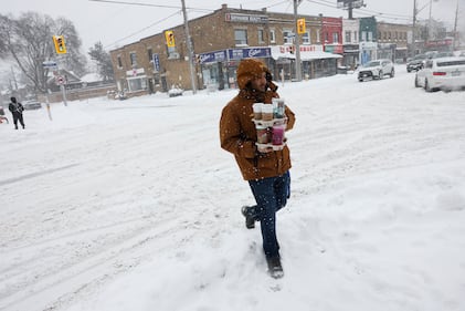 A pedestrian crosses Bayview Avenue while carrying several drinks on a snowy day in midtown in Toronto. (Lance McMillan/Toronto Star)