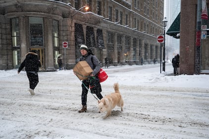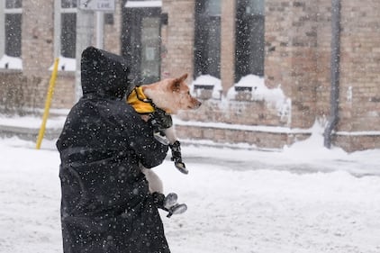 A woman carries her dog as she walks during a heavy snowstorm in Toronto. (Mert Alper Dervis/Anadolu via Getty Images)