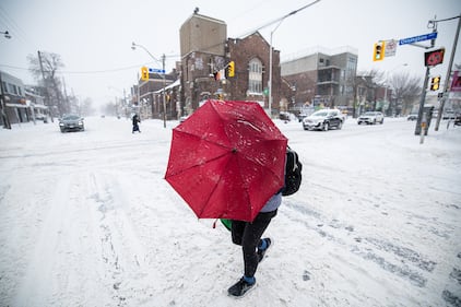 A person uses an umbrella to block the wind and snow as they walk across the intersection of Ossington and Bloor while the GTA is hit by a large snowstorm. (Nick Lachance/Toronto Star via Getty Images)