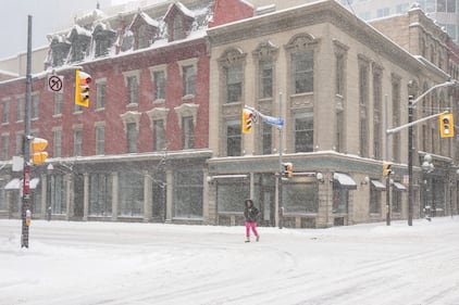 A pedestrian crosses King Street East amid heavy snowfall and accumulation as snow and heavy winds continue to hammer the Greater Toronto Area, in Toronto, Thursday, Jan. 15, 2026. THE CANADIAN PRESS/Giordano Ciampini