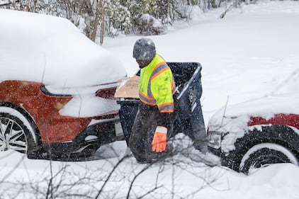 Toronto, ON - January 15: A Green for life (GFL) sanitation worker pulls a recycling bin through thick snow during a major snowstorm in downtown Toronto. (Nick Lachance/Toronto Star via Getty Images)