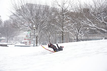 A parent carries their child on a sled on Jan. 15, 2026. Most schools in the Greater Toronto Area have been closed due to the significant snowfall.