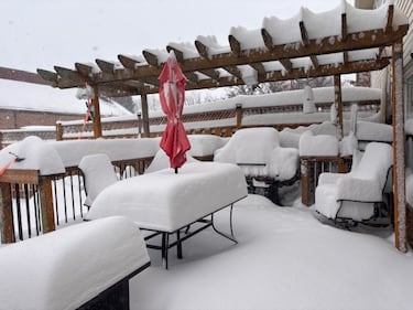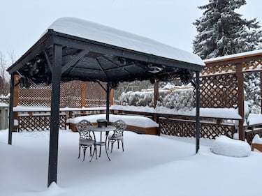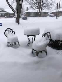 A patio set is nearly buried under a thick blanket of fresh snow on January 15, 2026 in this image provided to CP24.