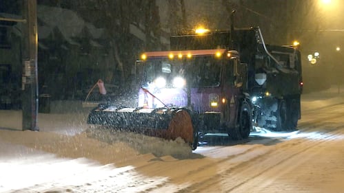 A snowplow makes its way along a road in Toronto, Friday, Jan. 16, 2026.