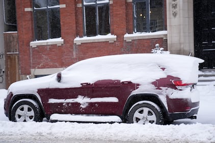 A snow-covered car is seen parked on a street during snowstorm in Toronto. (Mert Alper Dervis/Anadolu via Getty Images)