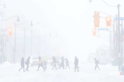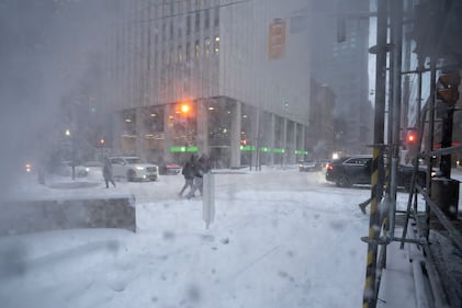 Pedestrians cross Bay Street along Front Street amid heavy snowfall and accumulation as snow and heavy winds continue to hammer the Greater Toronto Area, in Toronto, Thursday, Jan. 15, 2026. THE CANADIAN PRESS/Giordano Ciampini