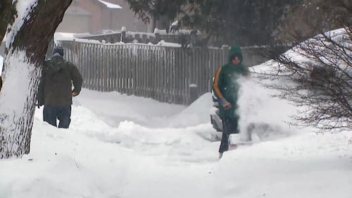 Workers remove snow amid heavy snowfall and accumulation as snow and heavy winds continue to hammer the Greater Toronto Area, in Toronto, Thursday, Jan. 15, 2026. THE CANADIAN PRESS/Giordano Ciampini (Giordano Ciampini/THE CANADIAN PRESS)