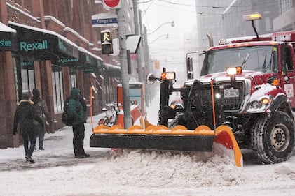 A snowplow makes its way along the road during snowstorm in Toronto. (Mert Alper Dervis/Anadolu via Getty Images)