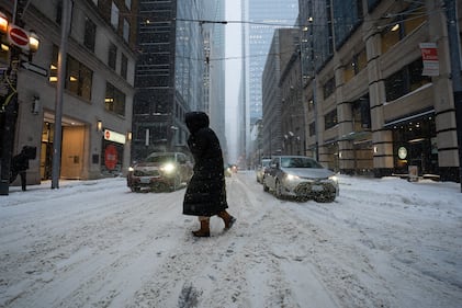 A pedestrian crosses at Yonge Street and Wellington Street in downtown Toronto, as a snow storm hits the city on Thursday, Jan. 15, 2026. THE CANADIAN PRESS/Chris Young (The Canadian Press)