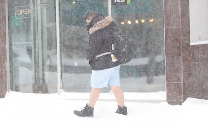 A pedestrian wearing shorts makes their way east along Eglinton Avenue on a snowy day in midtown in Toronto. (Lance McMillan/Toronto Star)
