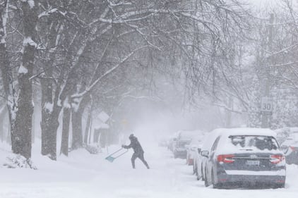 A man shovels snow as a major winter snowstorm hits Toronto. (Creative Touch Imaging Ltd./NurPhoto via Getty Images)