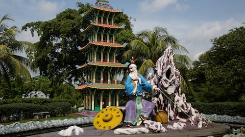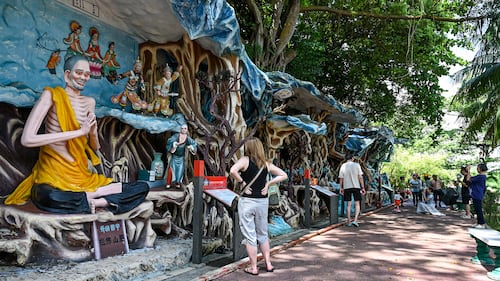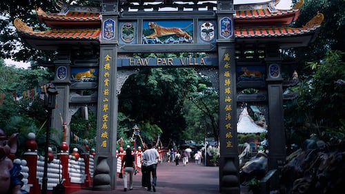 This photo taken on May 1, 2024 shows visitors walking past statues at Haw Par Villa.