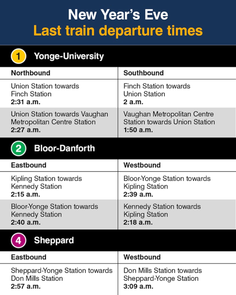 The TTC says subway service will run “later than usual” but that the last trains on each line will mostly depart before 3 a.m., with night buses running until 8 a.m. the next day.
