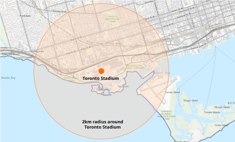 Part of its agreement as a host city includes enforcing FIFA’s trademark rights, including implementing a brand-exclusive zone circling the Toronto Stadium and FIFA Fan Festival. This “controlled area,” as the city calls it, envelops a two-kilometre radius surrounding the arena on match days and the days before a game.